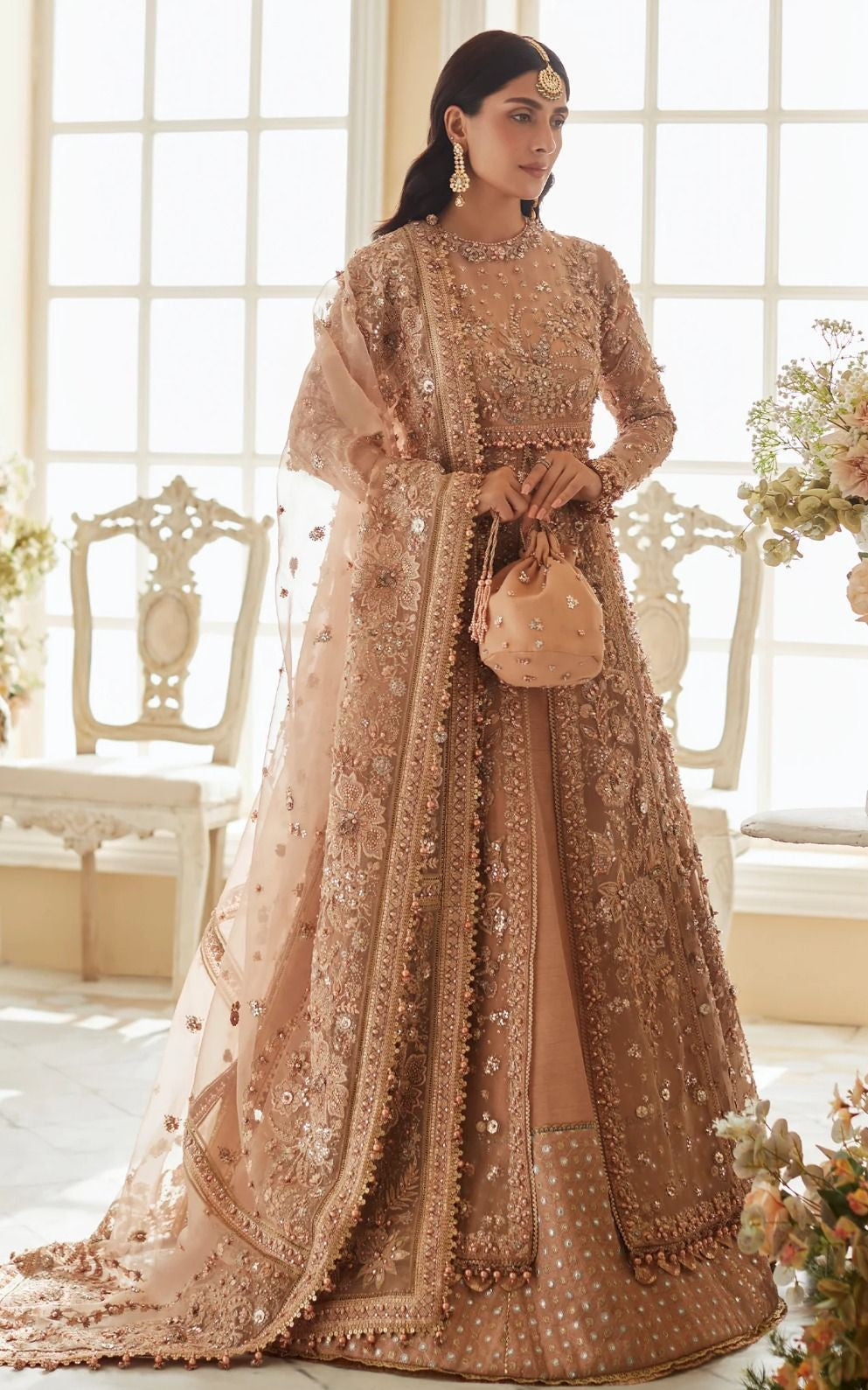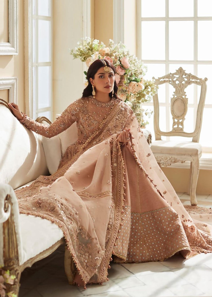 Step into the world of glamour with ‘Ariana’ - a masterpiece of finesse and opulence rendered in the dreamiest hue of crepe pink. Adorned with sparkling crystals, pearls, and shimmering tilla work, this dress showcases a frosted bodice that's nothing short of breathtaking. The sheer fabric, accented with iridescent embellishments, flows gracefully with a center slit, anda belted waist that beautifully accentuates femininity. Paired with a delicate organza dupatta adorned with scintillating embellishments, and a pure raw silk lehanga, this timeless beauty is a classic that's sure to turn heads.