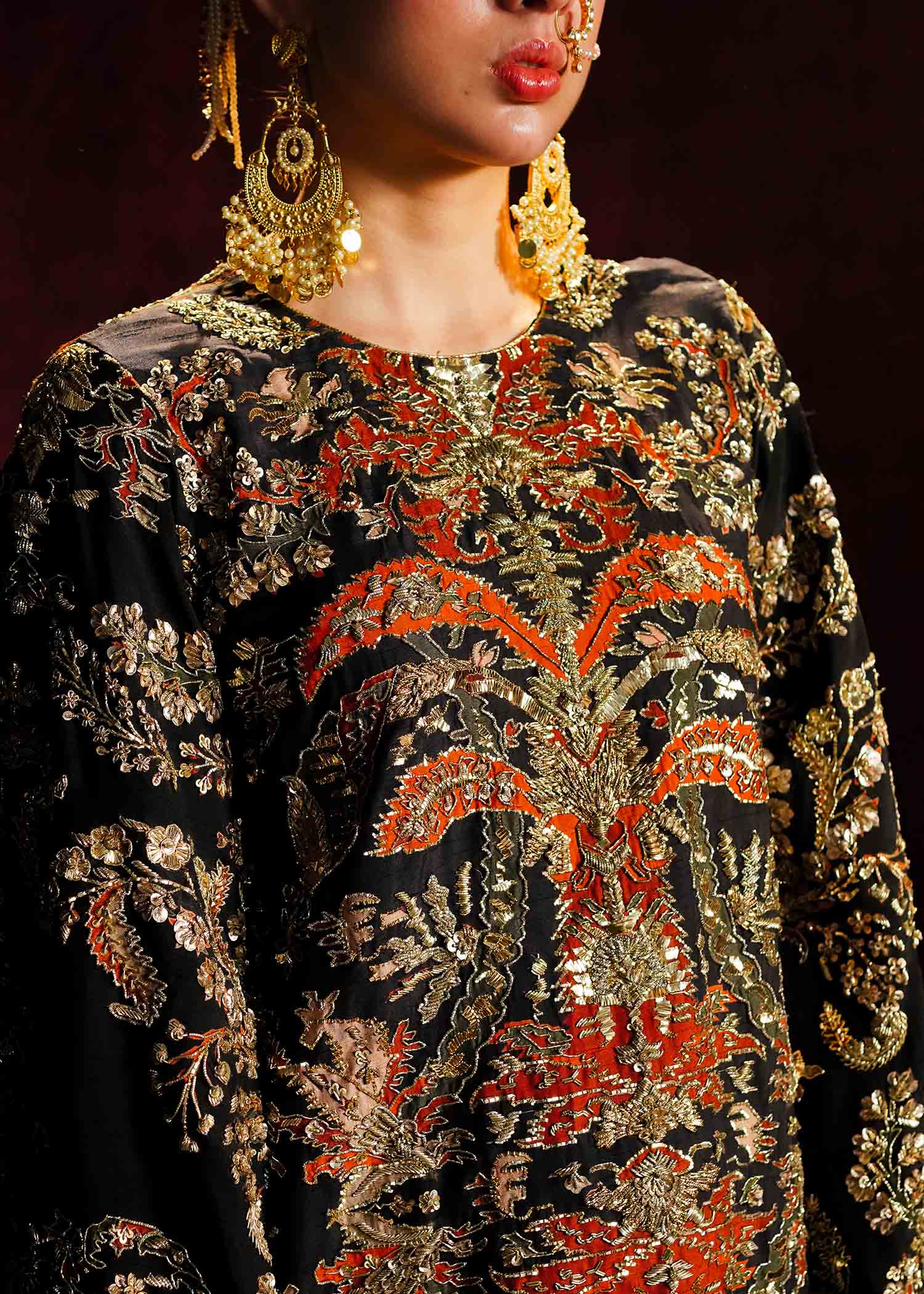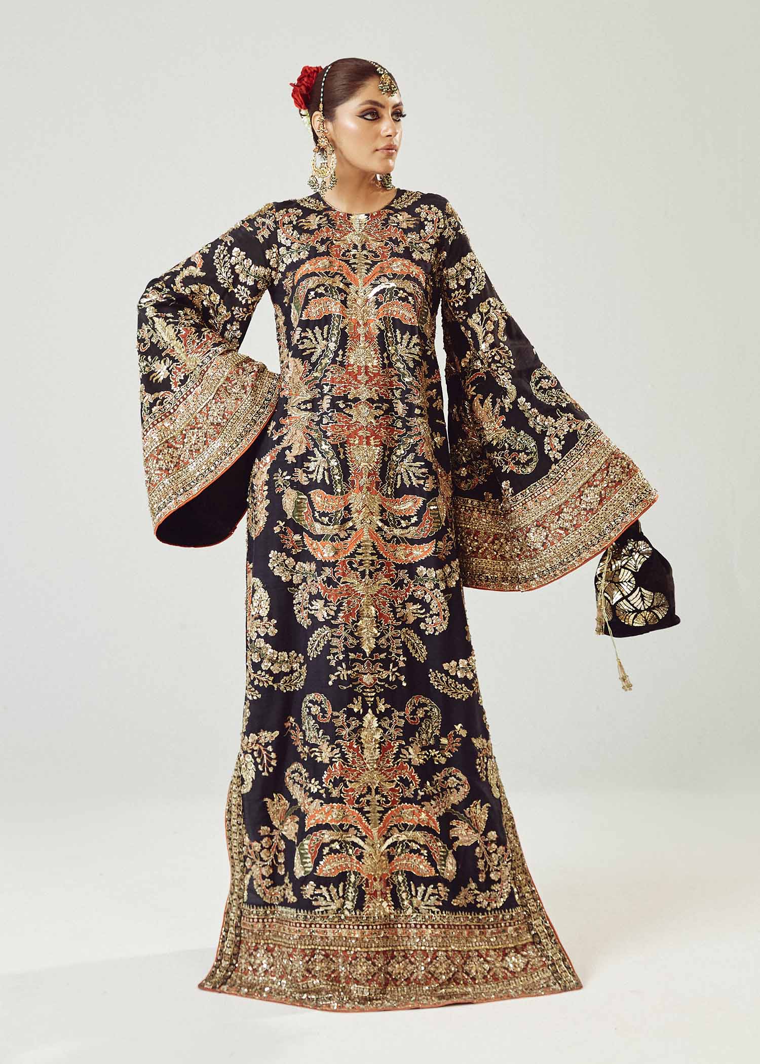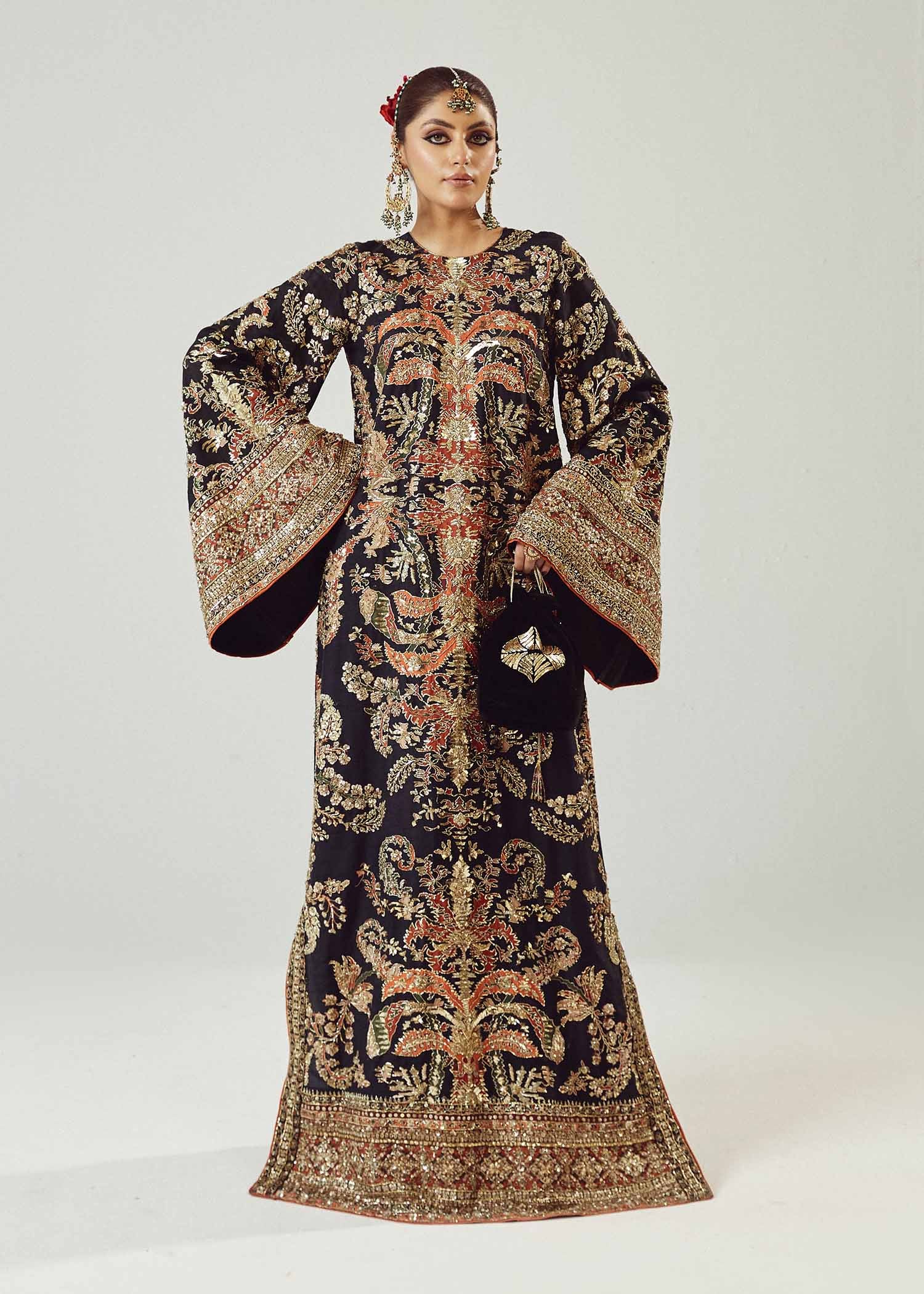 This jaw-dropping printed raw silk long shirt, embellished with intricate adda work of mukesh, naqshi, sequins, gotta and traditional materials. It's a true masterpiece, combining contemporary flair with timeless craftsmanship..
