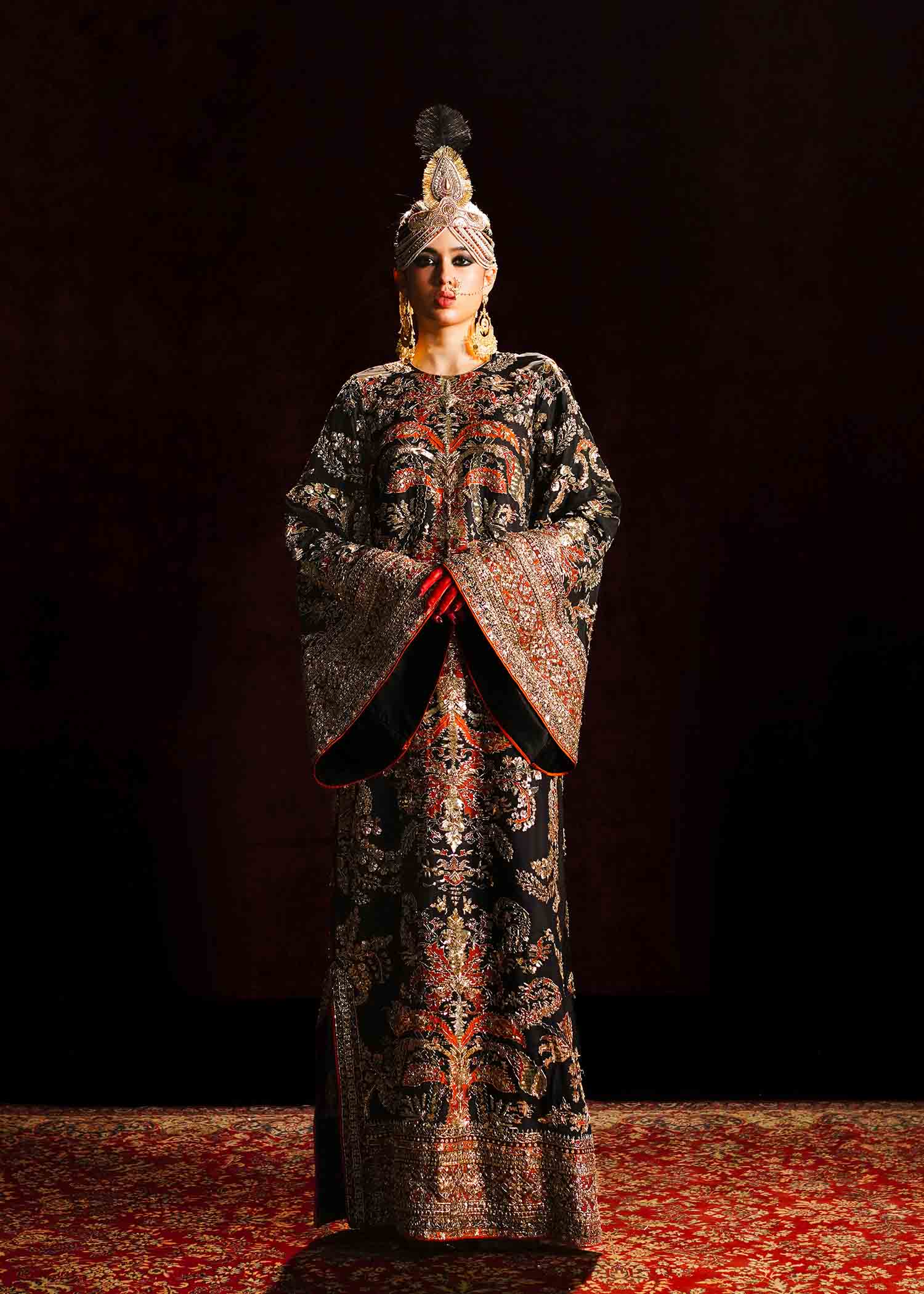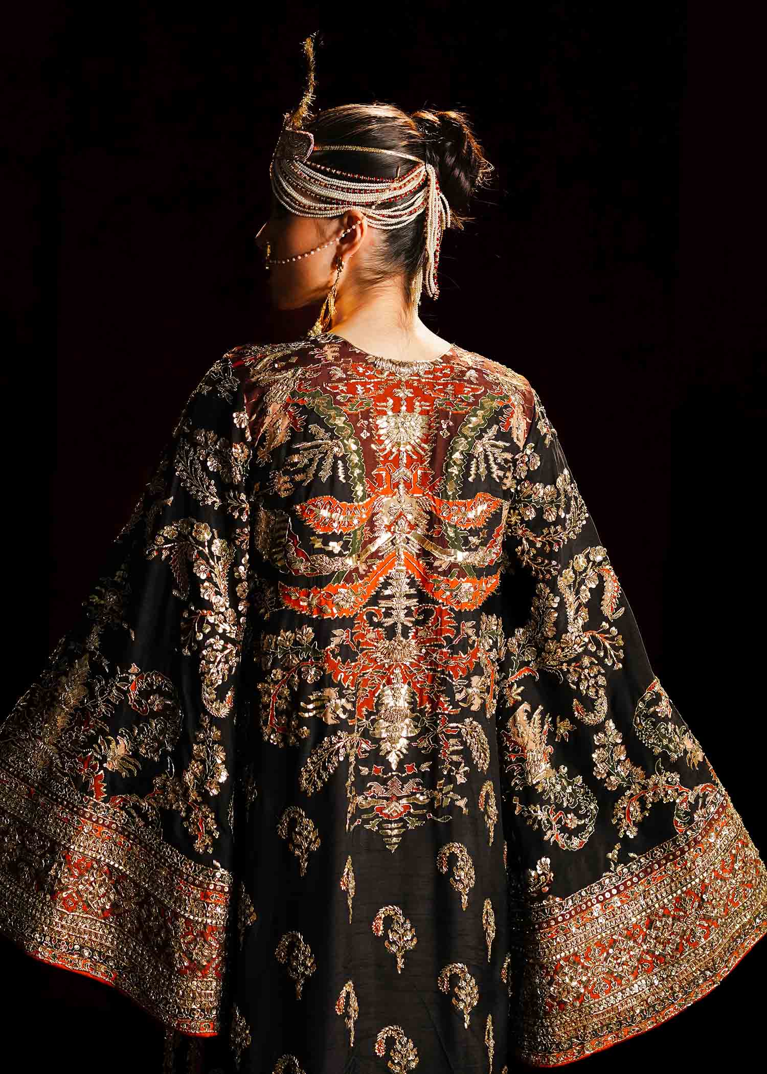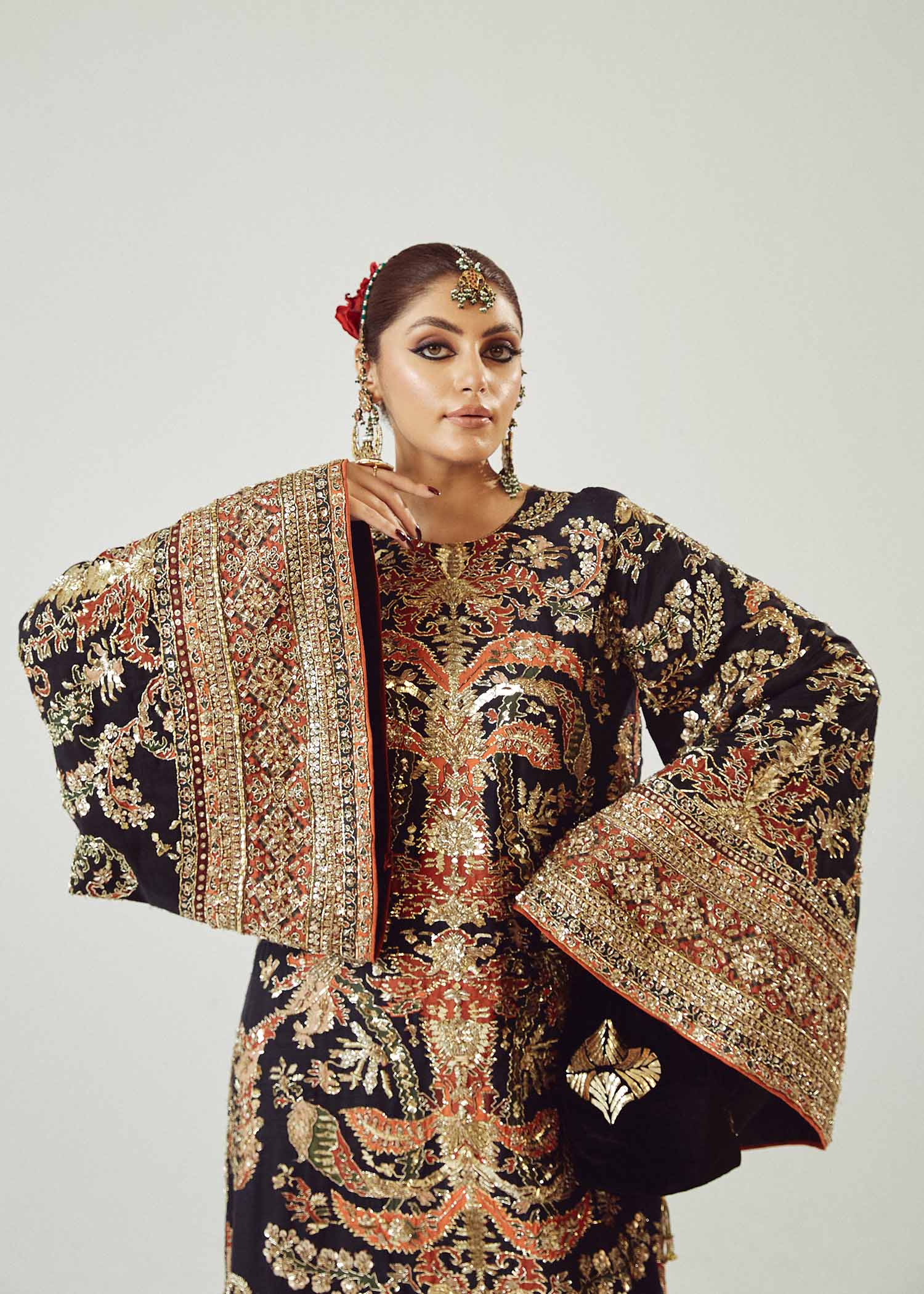 This jaw-dropping printed raw silk long shirt, embellished with intricate adda work of mukesh, naqshi, sequins, gotta and traditional materials. It's a true masterpiece, combining contemporary flair with timeless craftsmanship..