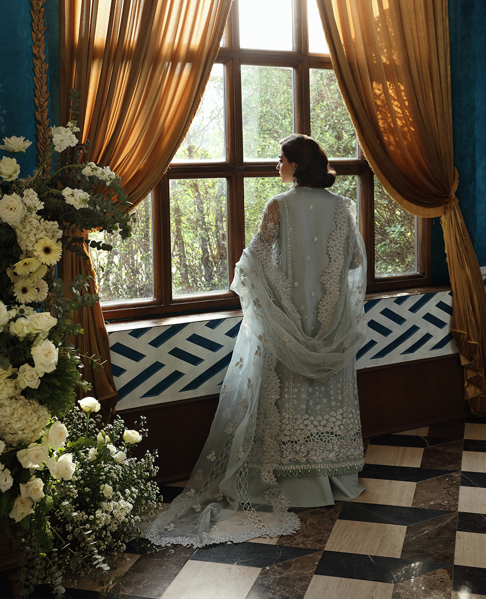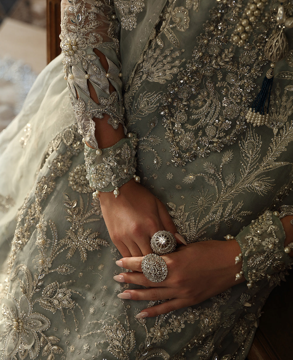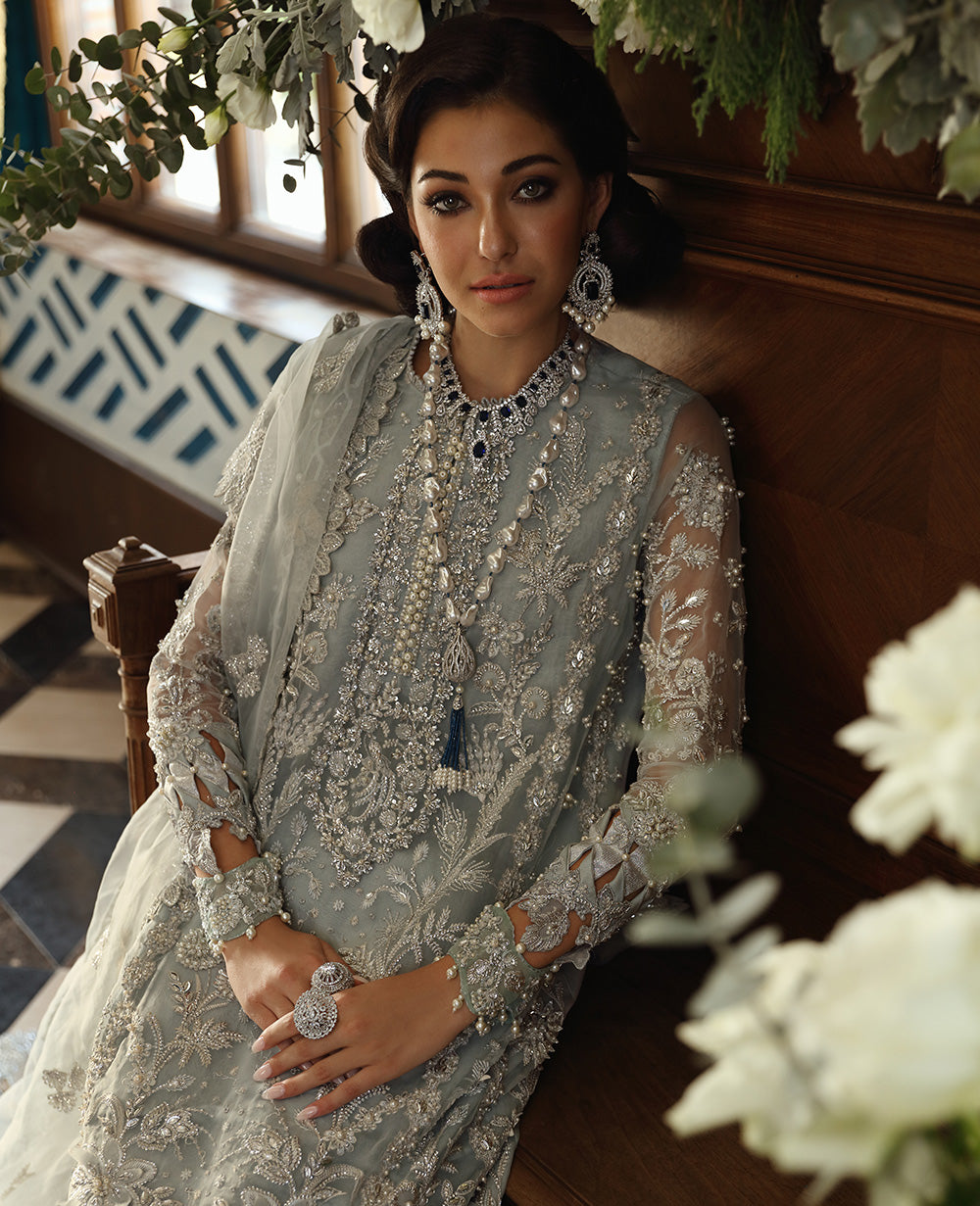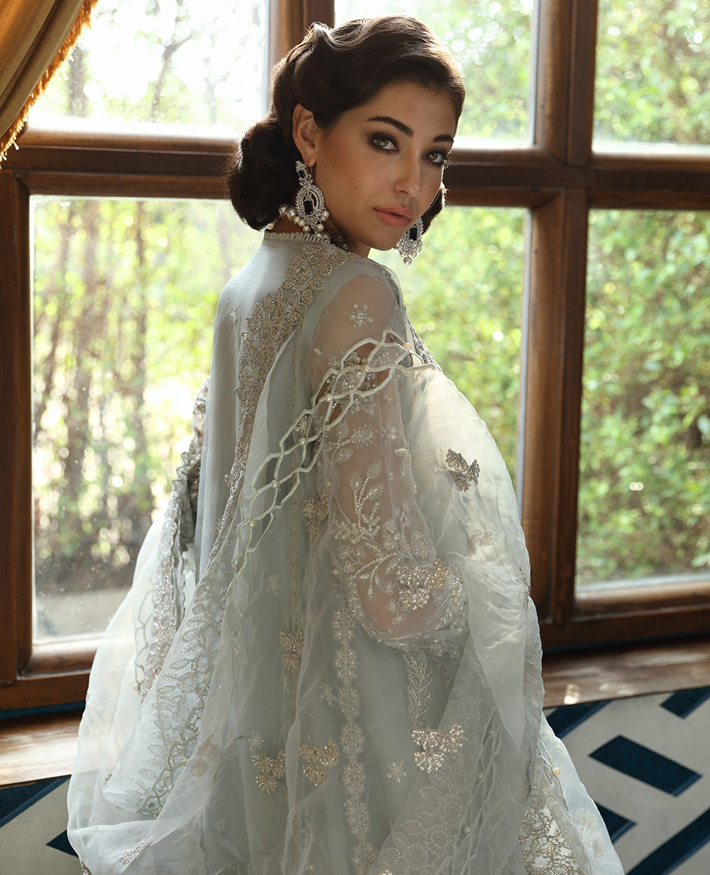 Iris illuminates with an unequivocal grandeur in this exquisite otherworldly shimmering blue, encrusted with intricate artisanal embellishments throughout its panelled silhouette. The dupatta and flared shirt are embellished with sumptuous cutwork details. It is draped over a decadent sharara pant, forming a regal and resplendent ensemble.