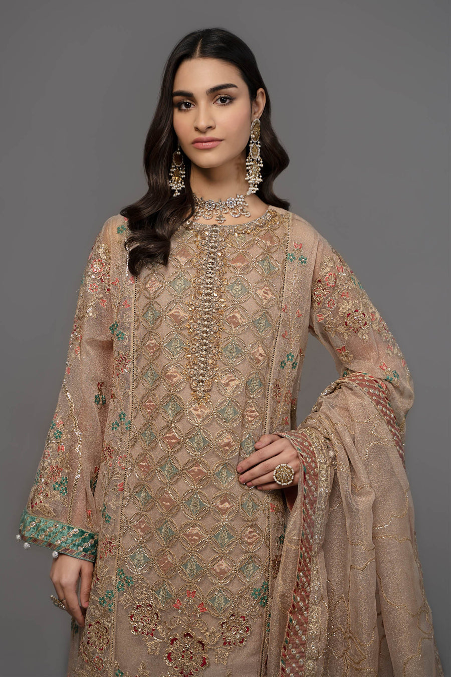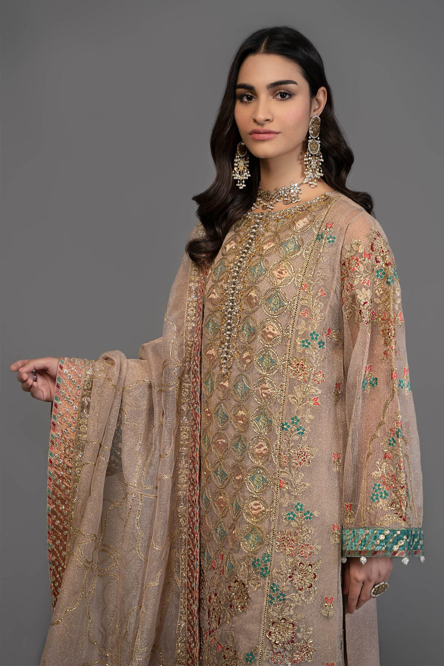 Embroidered Zari Net Sleeves with Pearl Finishings